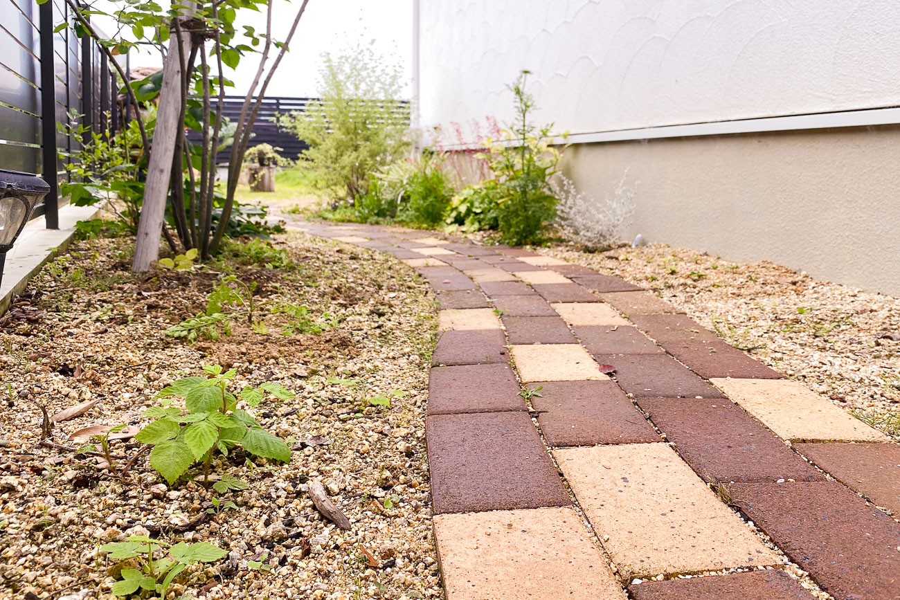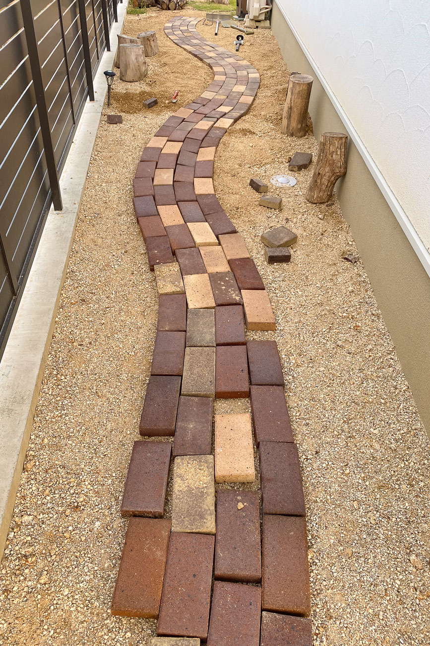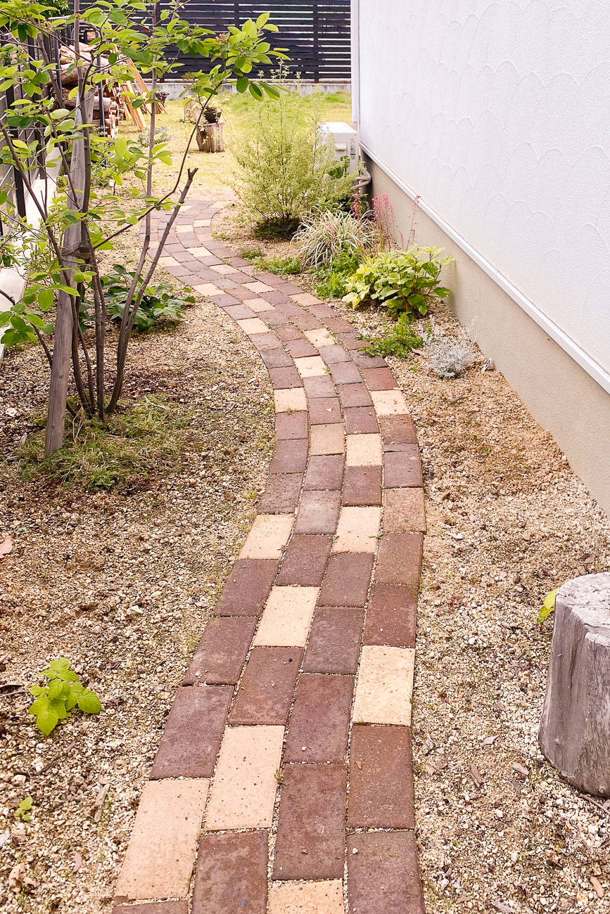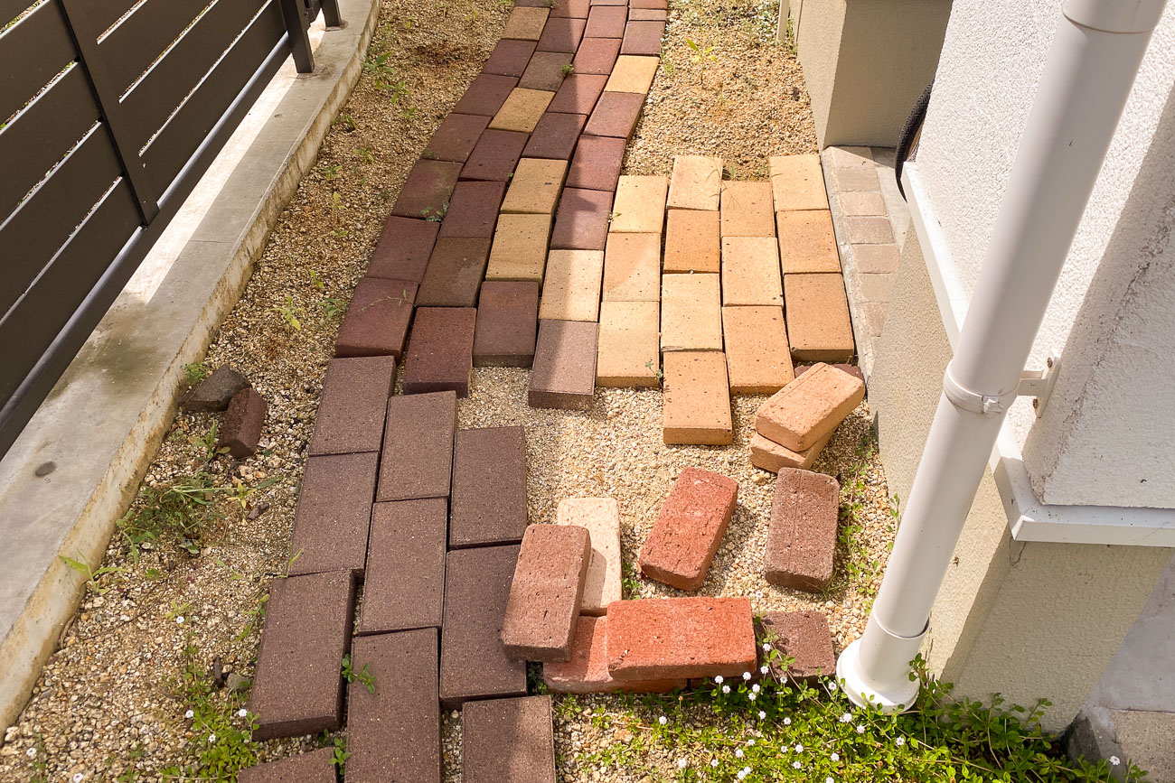 我が家では玄関側から庭に続くせまい道を、DIYでレンガの小道にしました。