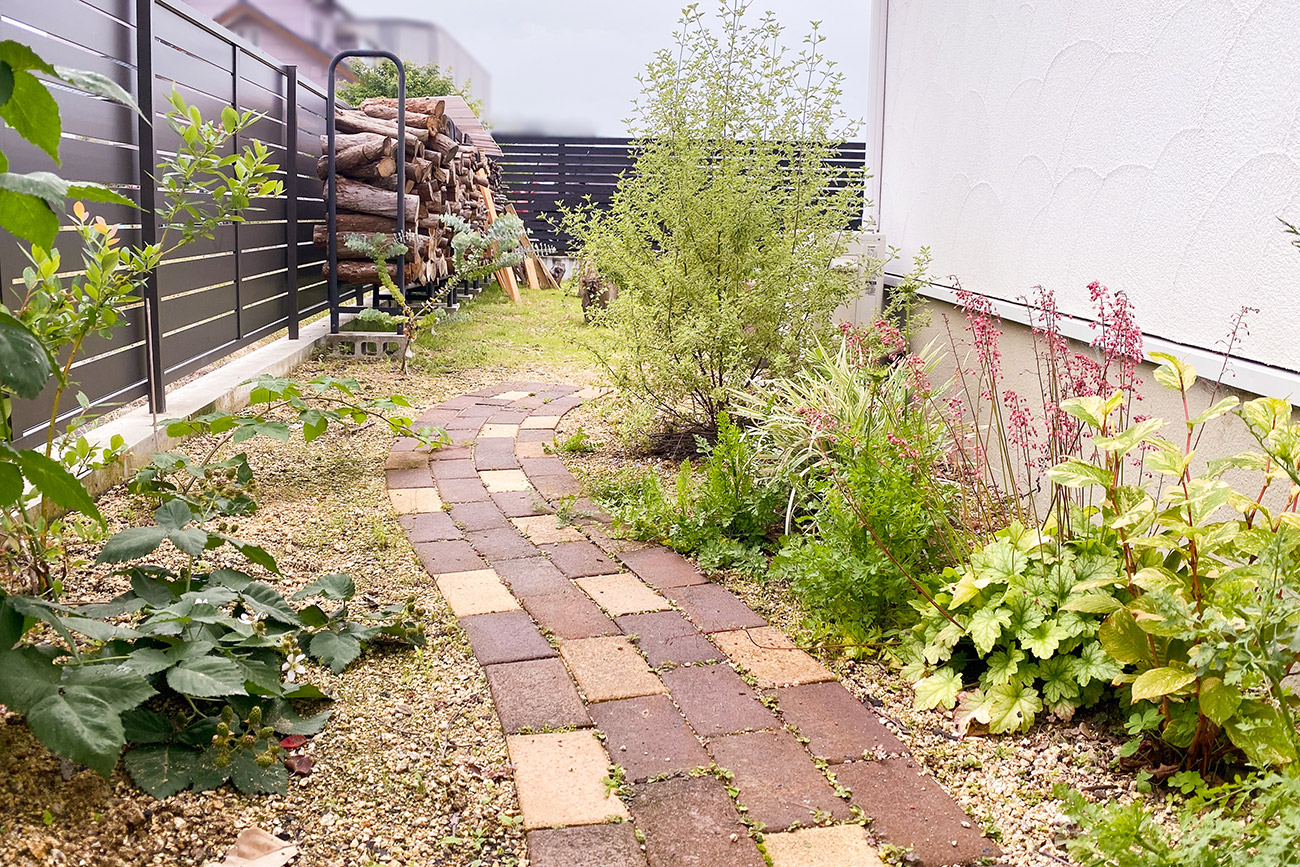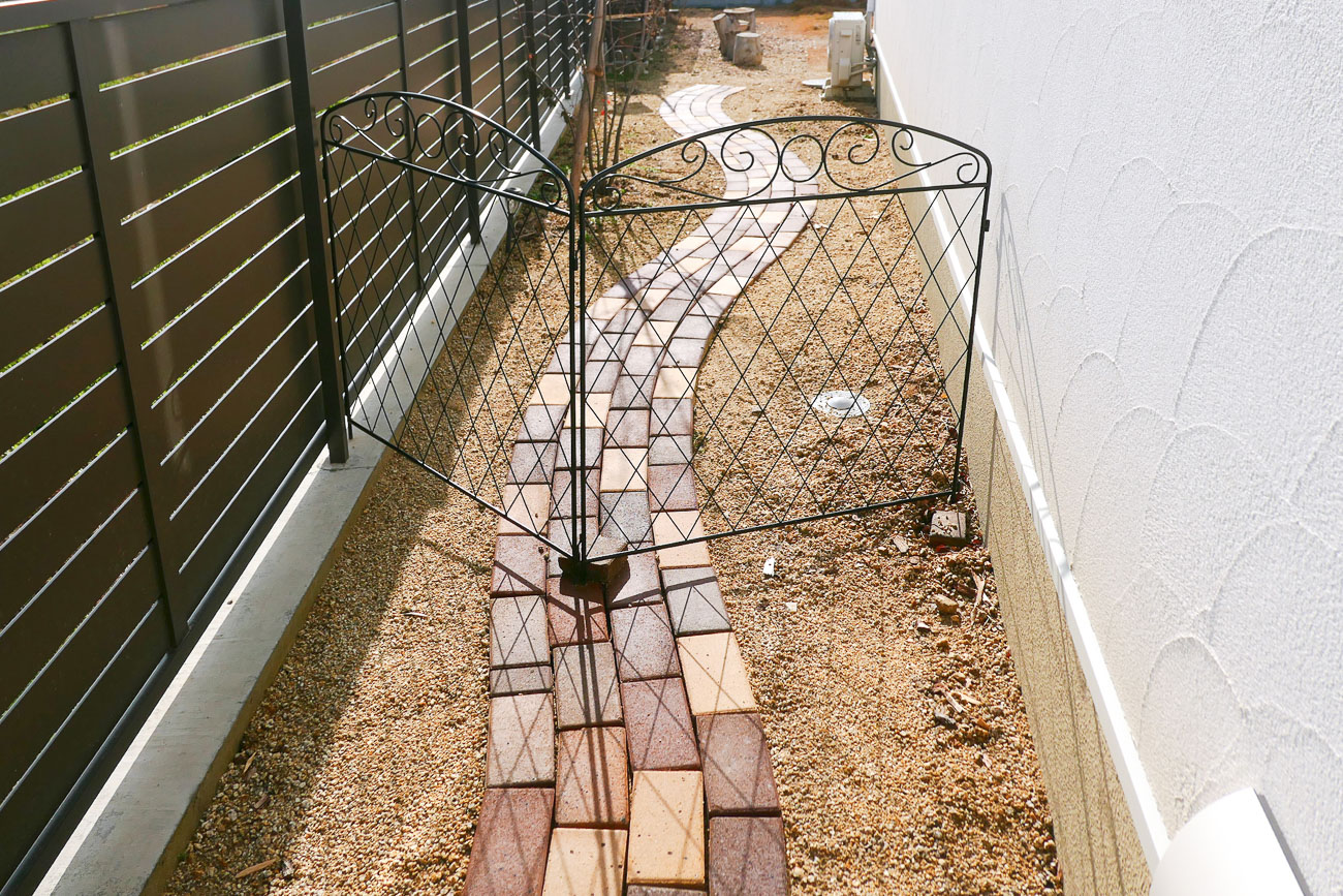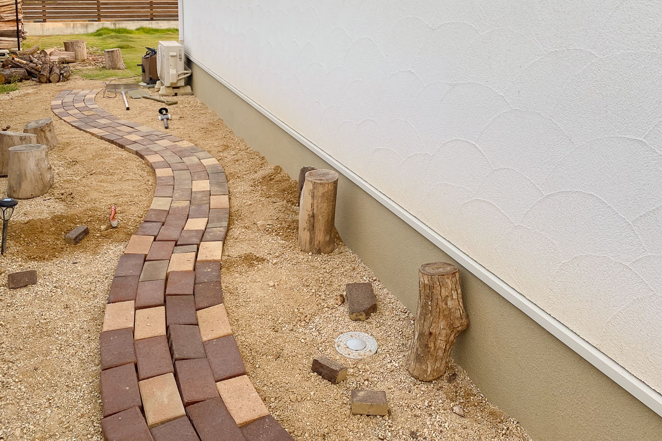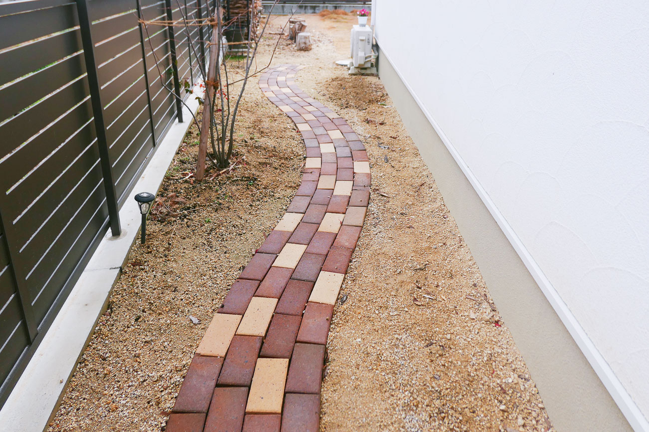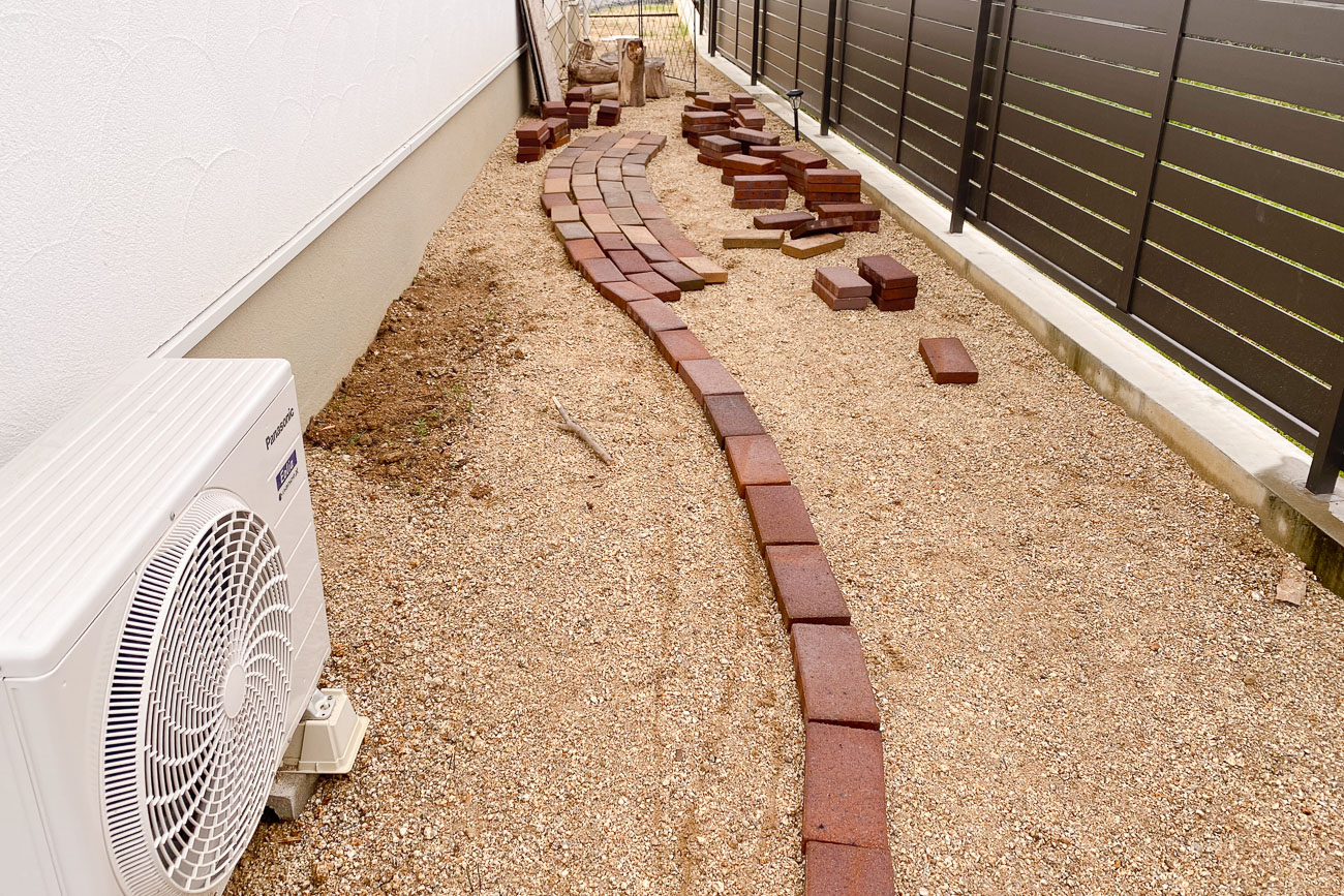 我が家では玄関側から庭に続くせまい道を、DIYでレンガの小道にしました。