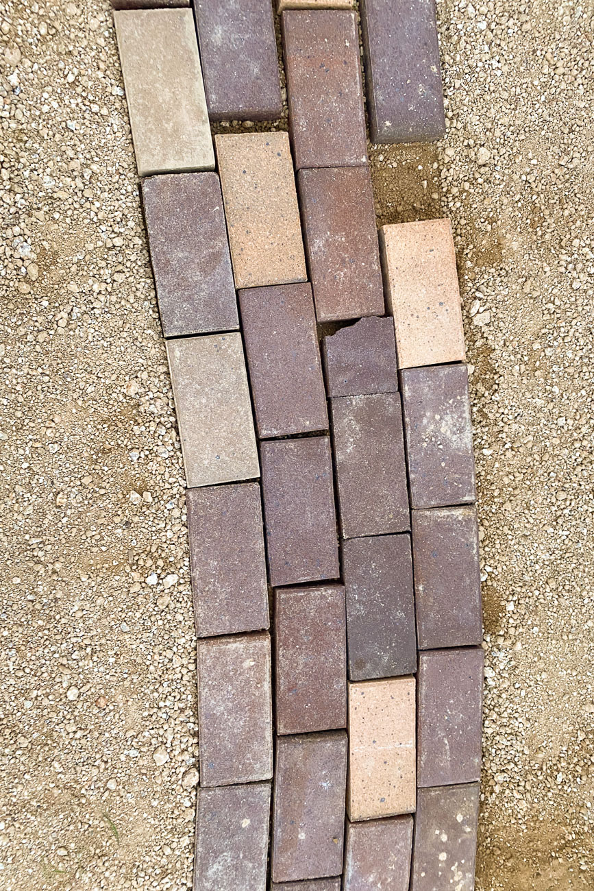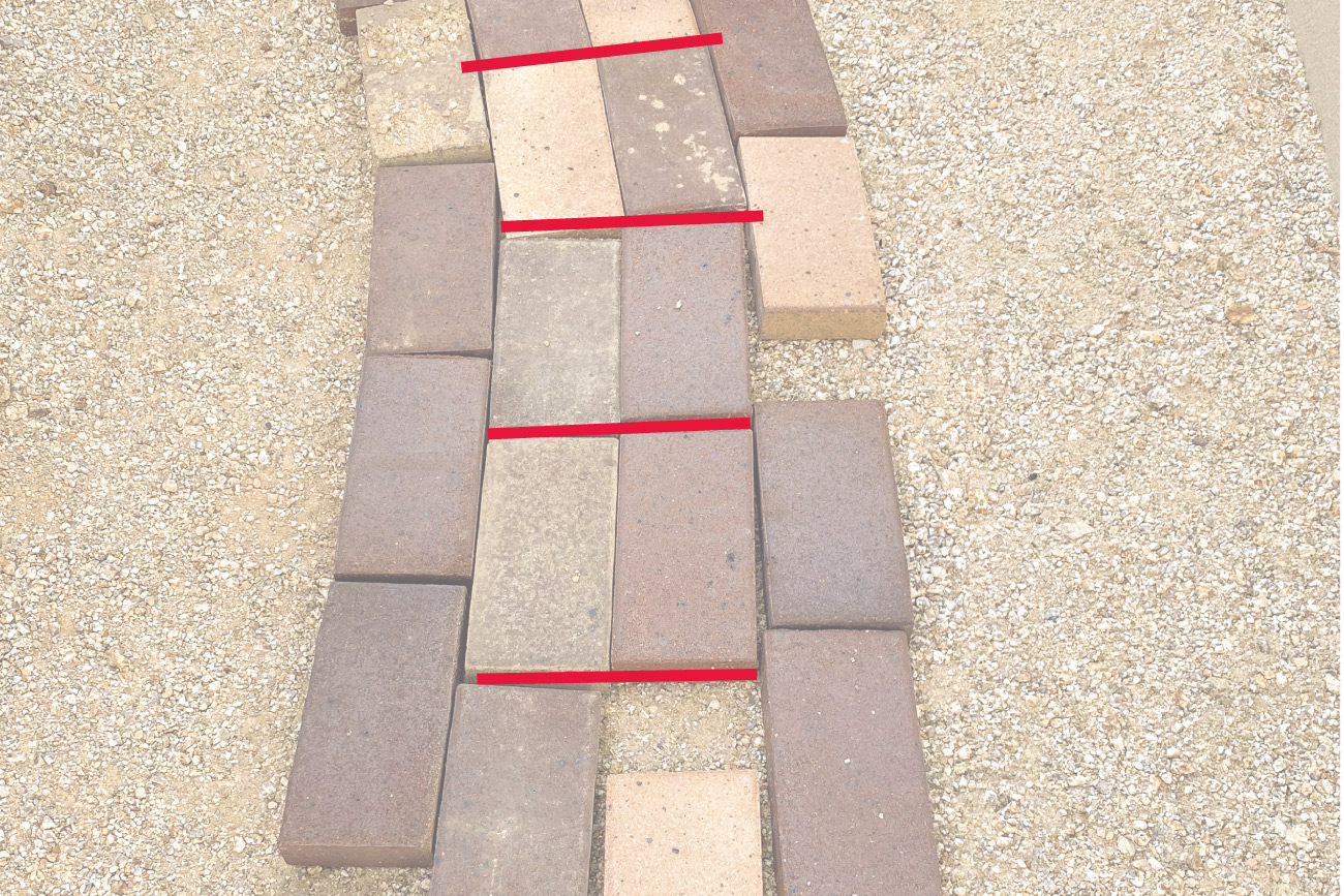 レンガの小道を作るときに気をつけたことの2つ目は、レンガとレンガの境目がそろわないようにすることです。